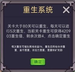 重生功能需在通过80关后解锁,每日拥有5次重生机会。重生后,关卡进度、伙伴状态、金币数量以及矿石奖励都将恢复初始状态,同时会获得重生值,该数值可用于神器的获取与升级操作。