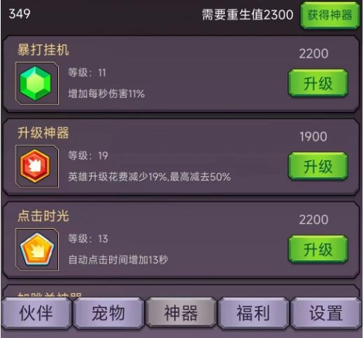 3、点击神器:点击伤害每级提升100%,满级为5000级。