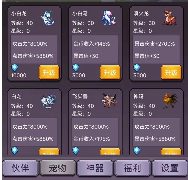 宠物是提升攻击力、点击伤害、暴击值、暴击伤害、金币收入的重要方式之一,获取它需要消耗钻石。