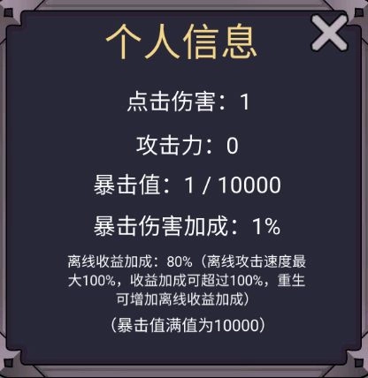 可以看到点击伤害、攻击力、暴击值、暴击伤害、离线收益加成之类的信息,偶尔查看一下即可。