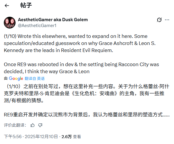 关于里昂回归的缘由,Dusk Golem提到:“要是故事的舞台重回浣熊市,那么安排一位曾亲身经历浣熊市事件的角色出场是符合逻辑的。他可以通过过去与当下的对照,为老玩家营造出一种‘重临旧地’的叙事感受,这虽是不少恐怖作品惯用的手法,可《生化危机》系列在此之前却从未真正采用过这种方式。”
