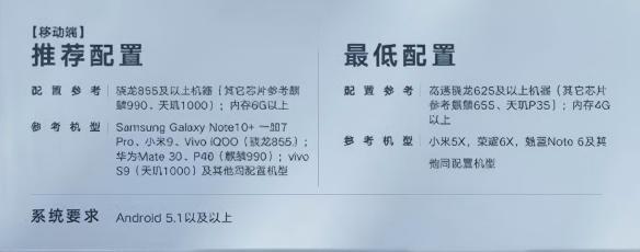 1、最低配置要求:搭载骁龙625、麒麟655或天玑P35处理器,搭配4G运行内存即可进入游戏,安卓5.1系统可确保兼容。