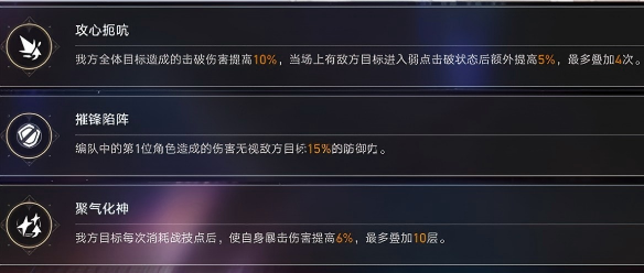 1当BOSS进入弱点击破状态时,敌方会解除所有减伤效果,行动被延后,同时受到100%的易伤效果;我方全体则会解除控制状态,立即执行一次行动,并恢复战技点。建议搭配部分进攻型辅助角色,助力快速削减敌方韧性条,成功击破BOSS后还能额外补充战技点。