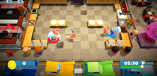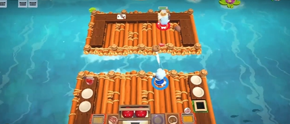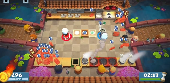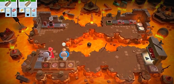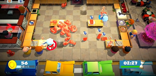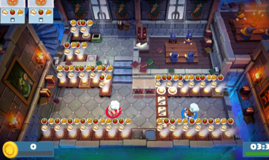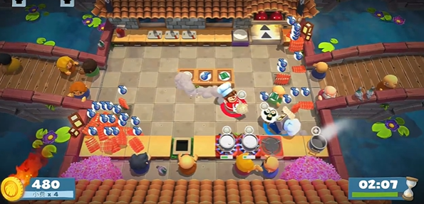 3、区域分工:分割式厨房(比如岩浆隔开),一人守一边,负责自己区域的切菜、烹饪,用投掷传递食材,不用来回跑。