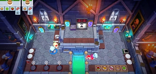 2、世界进阶:从火山寿司店、移动热气球厨房,到魔法学校、外星星球基地,关卡场景越往后越超乎想象(比如会翻转的地板、需要看红绿灯通行的马路、被岩浆隔开的操作台),食谱也从汉堡、卷饼升级到寿司、魔法蛋糕,双人协作的难度急剧上升。