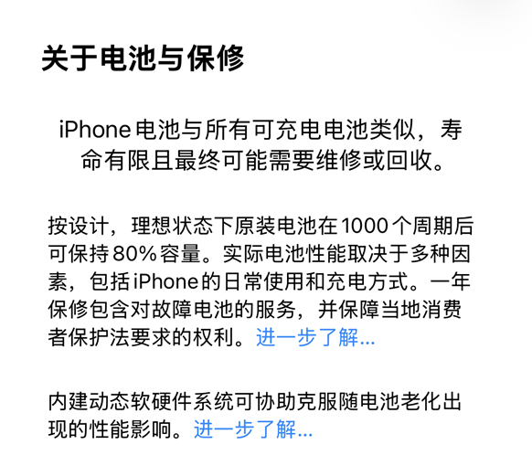 实际上,关于电池与保修,苹果官方早已经给出了相关说明:iPhone电池与所有可充电电池类似,寿命有限且最终可能需要维修或回收。