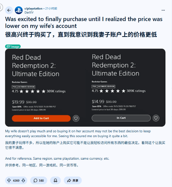 最近又有玩家分享了他和妻子两个PS账户上《荒野大镖客2:救赎》的商店购买页面,两个账户显示的定价分别为19.99美元和14.99美元,这一价格区间与上文总结的折扣范围相吻合。