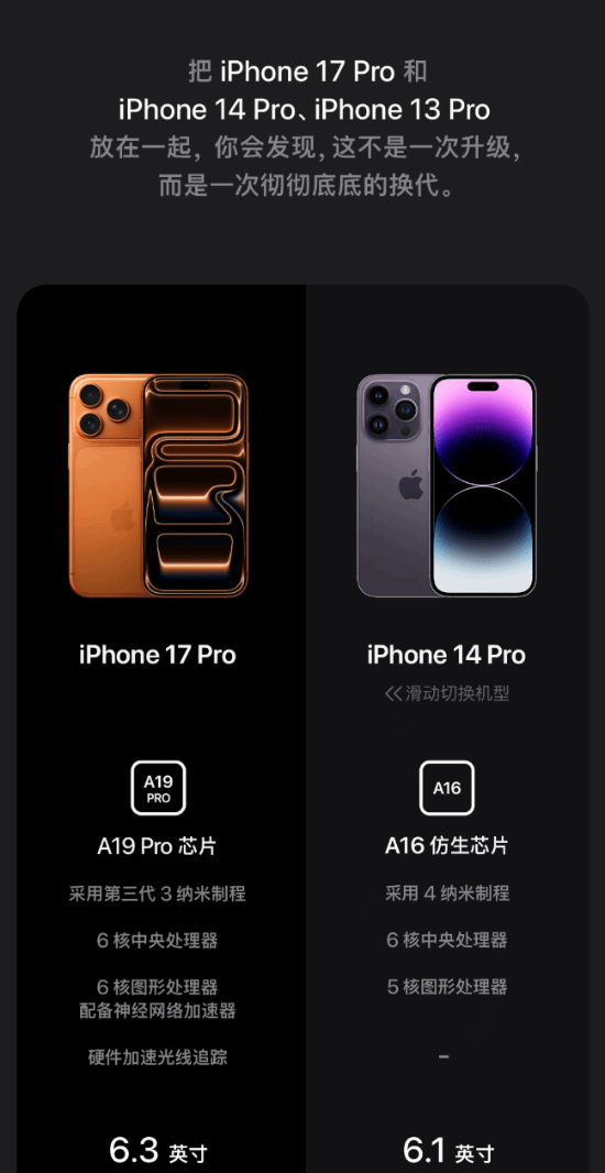 苹果方面称,把iPhone 17 Pro和前两代产品摆在一起对比就能发现,这并非一次简单的升级,而是一场全方位的彻底换代。