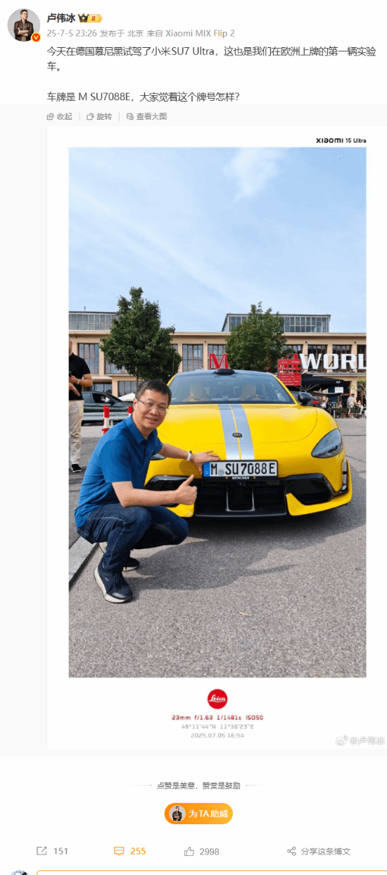 从卢伟冰分享的照片中可以看出,这辆SU7 Ultra有两个值得关注的地方:其一,它是小米在欧洲完成上牌的首辆实验用车;其二,其车牌号为“M SU7088E”,里面的“M”代表着“小米”,而“SU7”正是该车型的名称。