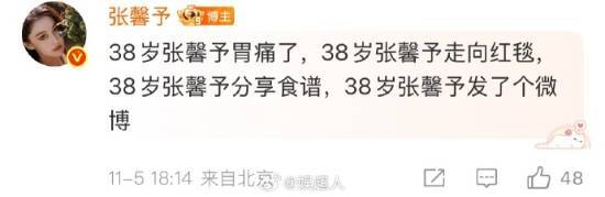 还有人模仿媒体的口吻在评论区讽刺道:“38岁的张馨予胃痛了,38岁的张馨予走上红毯,38岁的张馨予分享食谱,38岁的张馨予发了条微博”