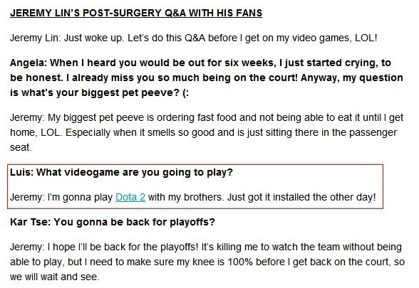 NBA新星林书豪近期刚做完手术,需要养伤六周左右,不少粉丝十分关心他的近况,他也通过Facebook和众多粉丝进行了交流。期间有位粉丝询问他养伤期间打算玩什么视频游戏,林书豪毫不犹豫地表示,他准备和兄弟一起玩DotA2。