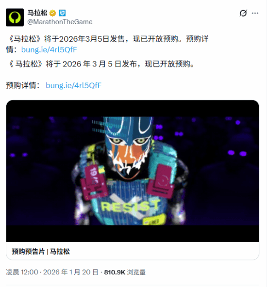 1月20日,Bungie在游戏官方推特上正式确认了其即将推出的撤离射击游戏《马拉松》的发布日期,本作将于2026年3月5日正式上线。