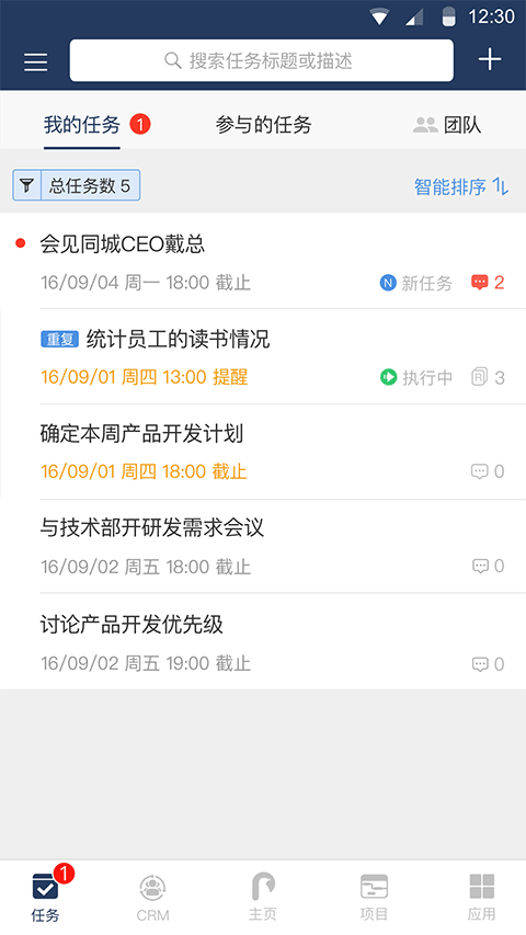 4、任务管理:无论何时何地都能掌握团队成员的任务进度,并及时处理任务中出现的问题。