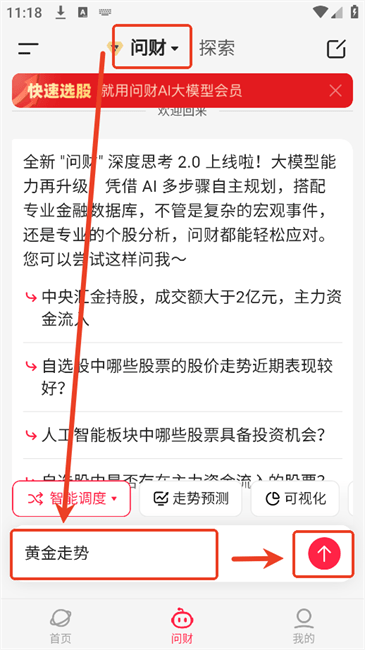 1. 打开软件,点击【问财】。选定【问财】后,在下方搜索框输入想要查找的内容,然后点击发送。