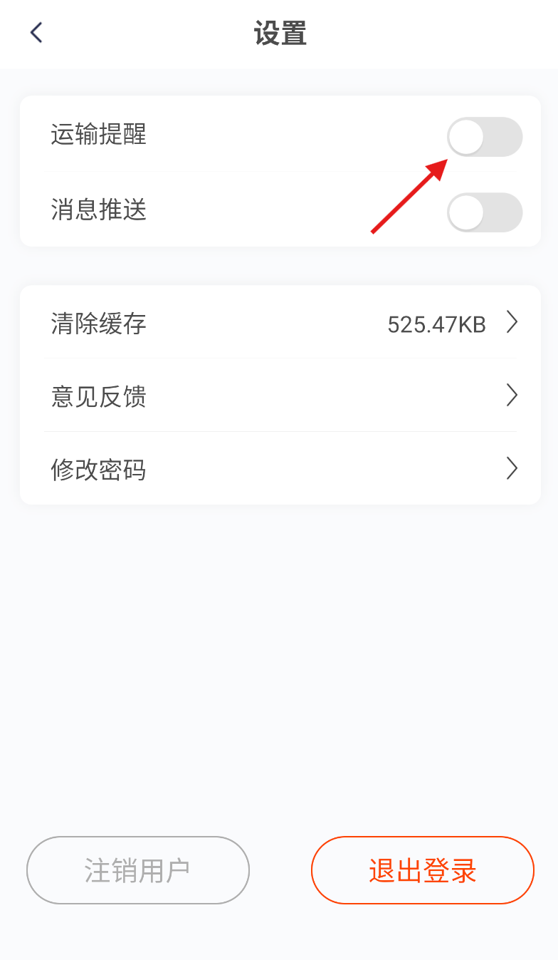 3、进入设置界面,在首行找到“运输提醒”选项,点击该选项旁的开关,就能开启运输提醒功能。