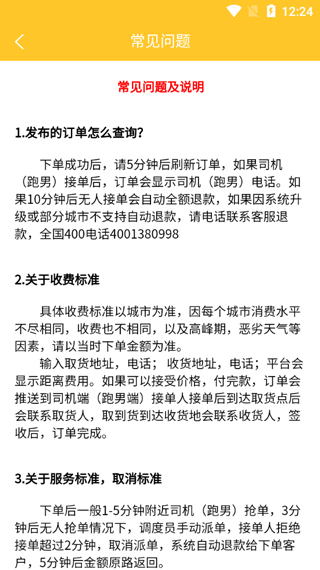 下单成功后,请于5分钟后刷新订单。若司机(跑男)接单,订单将显示司机(跑男)的电话。要是10分钟后仍无人接单,系统会自动全额退款。
