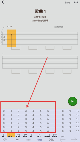 3、进入乐谱编辑页面,借助底部的音轨区域,编写音符并调试节奏,以此创作吉他曲谱内容。
