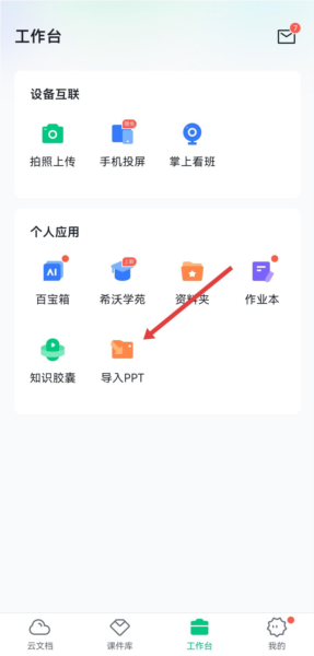 1. 开启希沃白板,进入到工作台界面,于个人应用区域中点击“导入PPT”选项。