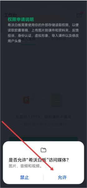 3、当出现是否允许希沃白板访问媒体权限的提示时,要点击允许。