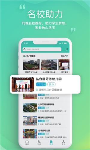 在平台上,用户能够获取邯郸热门教育新闻资讯,知悉最新教育政策与先进教育理念。平台的学院搜索功能涵盖邯郸地区数百所学校的详尽信息,其中包含幼儿园、小学、初中、高中这四大学段,助力家长全方位了解各学校情况。