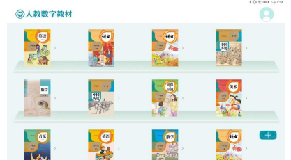 登录后进入的数字教材书架页面,呈现的是个人书架。点击“+”,就能将更多教材添加到个人书架。