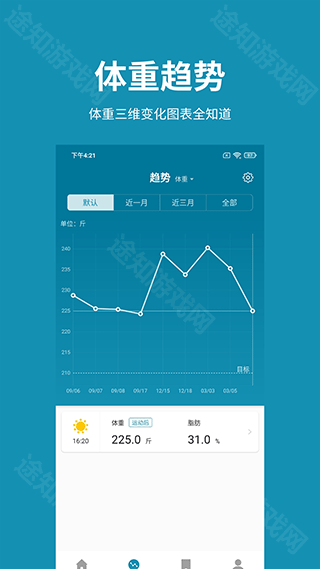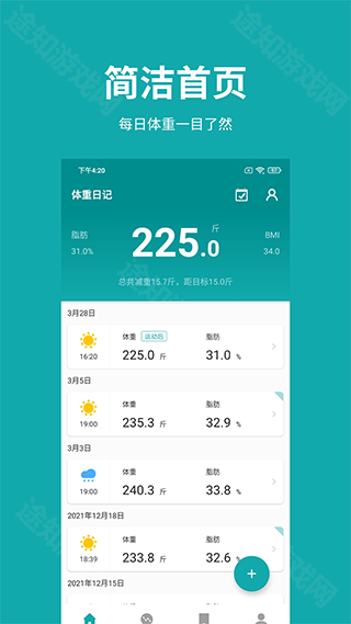 体重日记堪称一款极为实用的体重记录利器。借助它,用户无论何时何地,都能清晰知晓自身的体重波动与身体健康状况,并且能够便捷记录。这款软件界面设计简约大方,各类功能触手可及,哪怕是初次使用的新手,也能毫无障碍地轻松上手。尤其是那些有减肥或减脂需求的用户,不妨亲自体验一番。