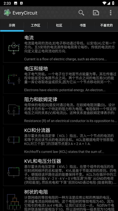 3、对我们应用程序所提供的各类组件进行试验。您能够选用电阻器、二极管、晶体管以及诸多其他组件!这些组件能够精准运行;所以,您只需将它们组合起来,观察其工作方式即可。从阅读中获取的部分信息,也可在此进行模拟,以作观察之用。