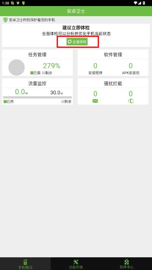 请点击首页里的全面体检选项,以此来对系统实施优化操作。