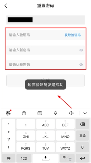 在【重置密码】页面,按照要求填写验证码,重新输入新密码后,点击【完成】按钮就可以了。