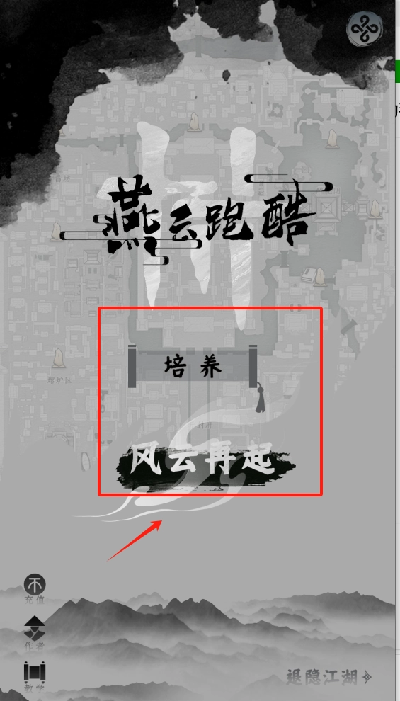 这是古风跑酷游戏的界面,左下角有教学按钮,点击可以学习玩法;右下角有退隐江湖按钮,点击即可退出游戏。