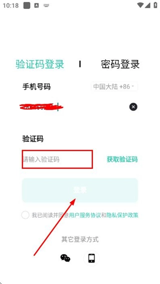 在验证码输入框内填入收到的验证码,随后点击登录按钮,以此完成账号登录流程。