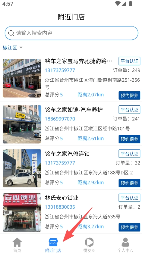 提供附近门店浏览功能,查看门店名称电话地址等信息,筛选合适的养护门店。