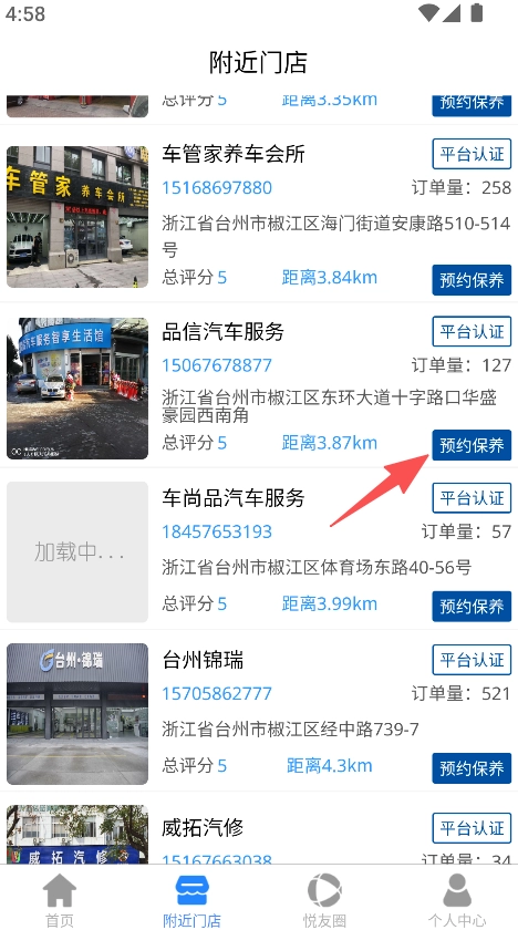 门店信息维度十分全面,涵盖订单量、评分、距离等内容,并且结合了平台认证,能让用户更方便地挑选到可靠的养护门店。