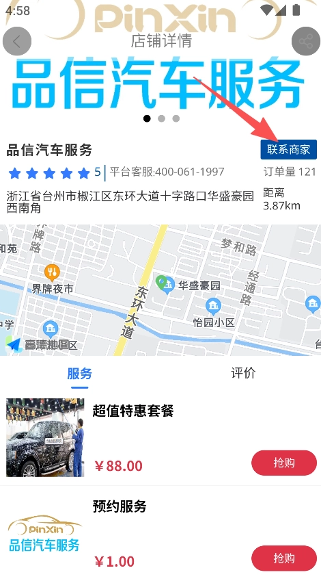 店铺详情页会展示各类服务套餐及其对应的价格,同时配备联系商家的功能,以此来优化服务对接的整个流程。