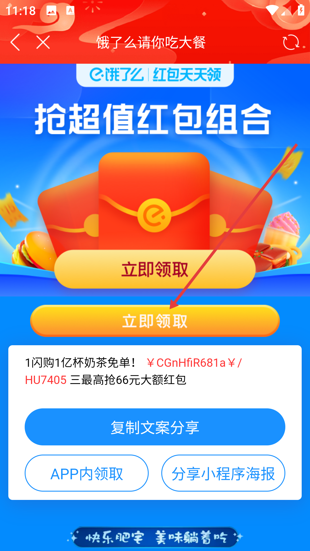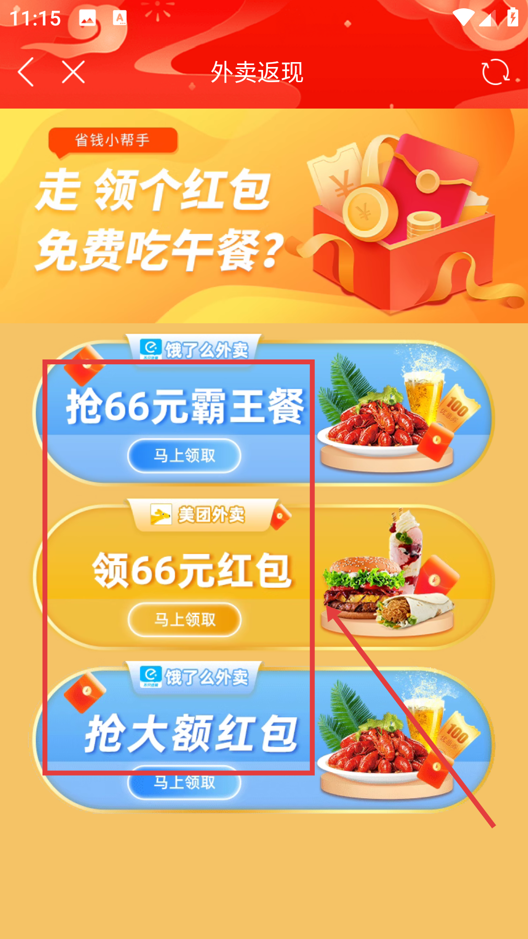 4、点击对应的领取按钮,比如【立即领取】,领取外卖红包后完成订单,就能获得返现奖励。