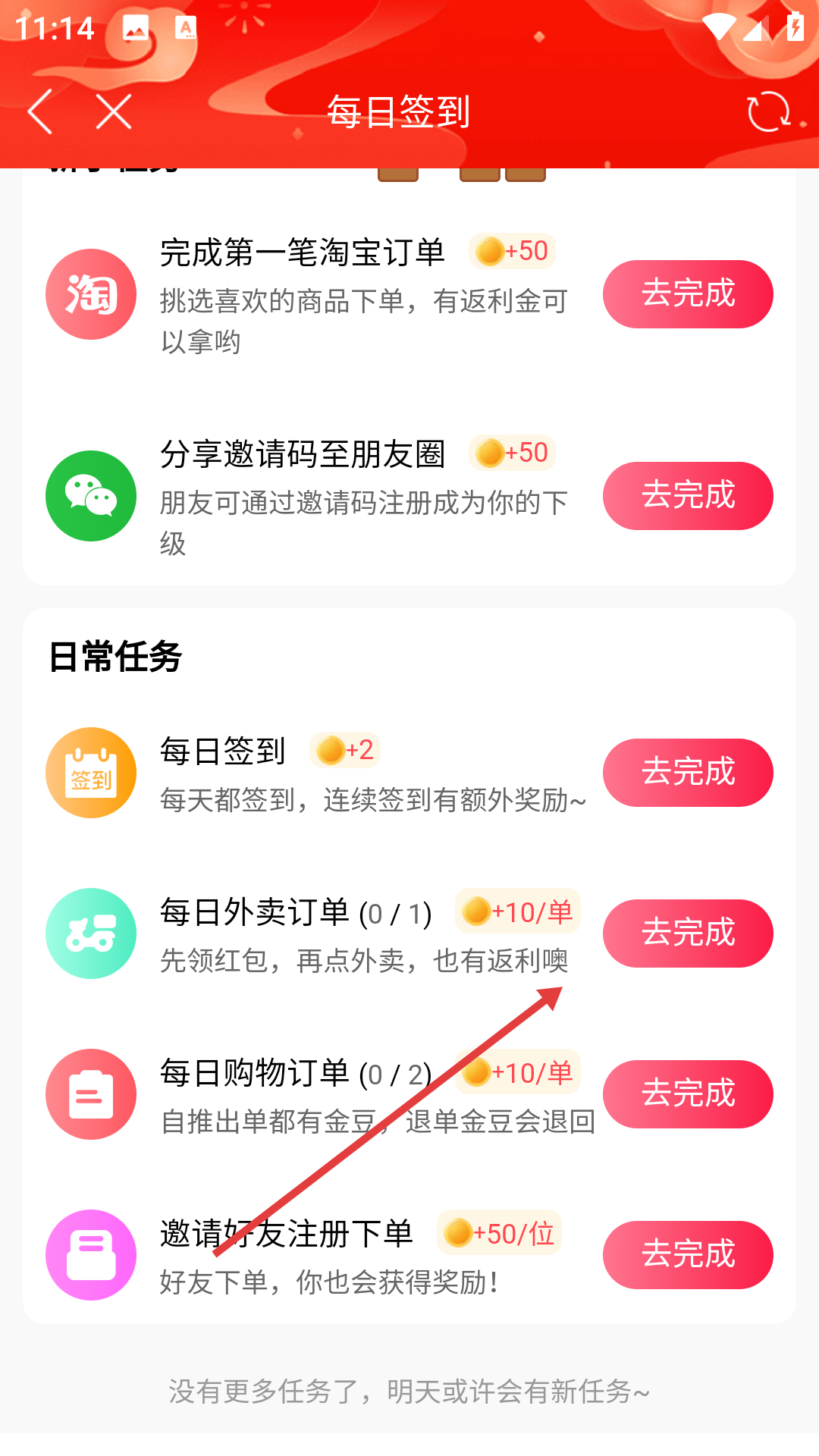 2、在签到页面找到【每日外卖订单】任务,点击【去完成】按钮。