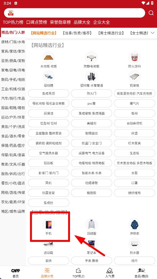 1、在品牌分类页面,点击【手机】分类图标,即可进入手机品牌页面。