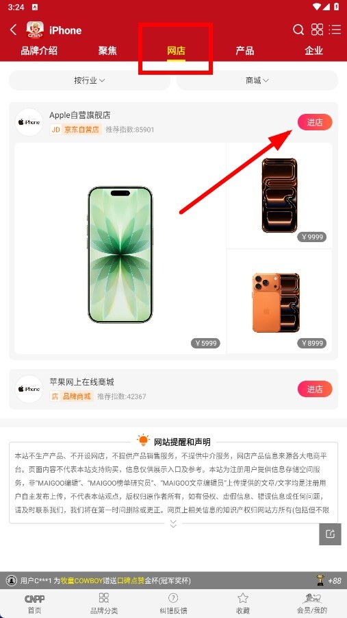 3、进入品牌详情页后,点击【网店-分类标签】,从中选择具体的网店(例如“Apple自营旗舰店”),即可进入该网店的商品页面。