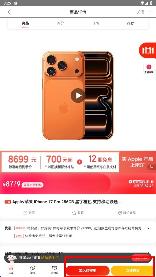 4、在网店的商品页面里,挑选自己感兴趣的商品,比如“AppleiPhone17Pro256GB”,进入该商品的详情页面后,能够点击【加入购物车】或者【立即购买】按钮来完成相应操作。