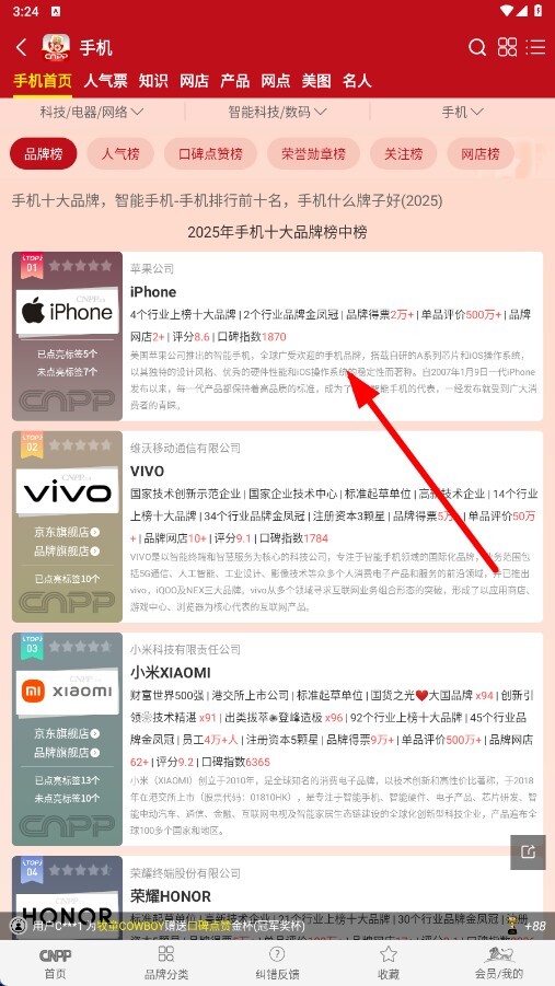 2、进入手机品牌页面后,挑选你感兴趣的品牌(例如“iPhone”),接着进入该品牌的详情页面。