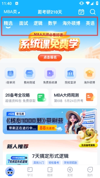 1、打开应用后,在首页能够点击【精选】【面试】【逻辑】【数学】【海外硕博】【英语】等分类板块,以查找对应的学习资源,同时也可以参与【系统课免费学】之类的活动。