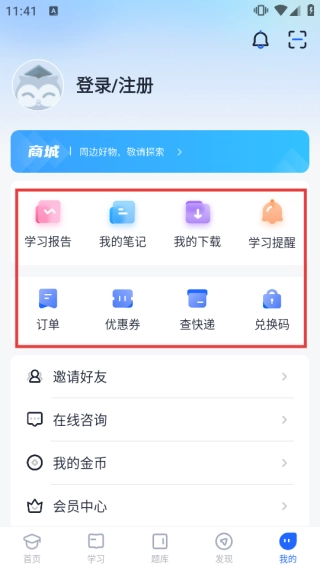 3、点击底部的【我的】选项,进入个人中心页面后,你可以查看【学习报告】【我的笔记】等与个人学习相关的信息,同时还能进行订单查询、使用优惠券、查询快递、兑换码兑换等操作。