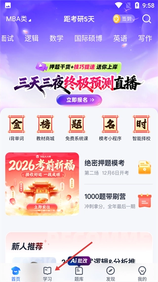 1、点击底部【学习】按钮,进入学习页面。