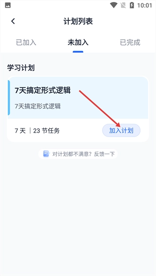 3、在计划列表的【未加入】标签页中,找到【7天搞定形式逻辑】这个计划,然后点击该计划右侧的【加入计划】按钮。
