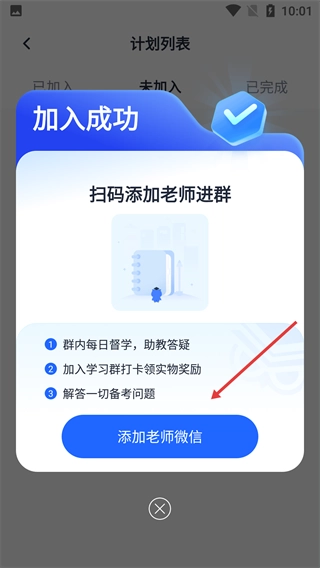 4、成功加入计划后,会弹出【扫码添加老师进群】的提示,点击【添加老师微信】即可获取督学等备考服务。