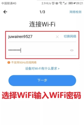 6、选择WIFI,输入WiFi密码点击下一步。(支持选择其他WiFi连接,不支持中文WiFi名称,不支持无线猫)