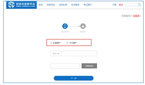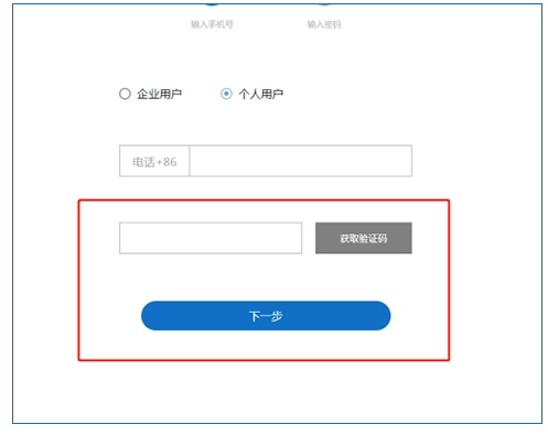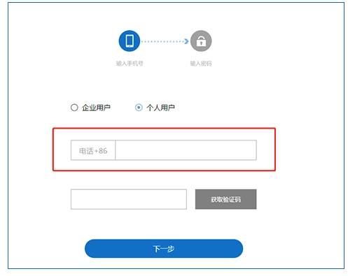 第二步:默认选择个人用户注册,若为企业用户,可切换至企业用户注册选项。