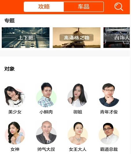 根据车主的性格属性,小车哎哟就分成霸道总裁、程序猿、小鲜肉、女神、吃货等十几个类目;而根据车主的出行需求,更有上下班、接小孩、泡妞、商务、自驾游等多个细分类目,甚至连车生活也涵盖进去,霸气侧漏!